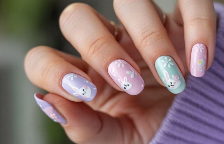 These nails use smooth pastel shades like lavender, pink, and mint with simple bunny faces and delicate white flowers. The minimal designs and soft colors create a sweet, calm Easter look that feels cute and cozy.