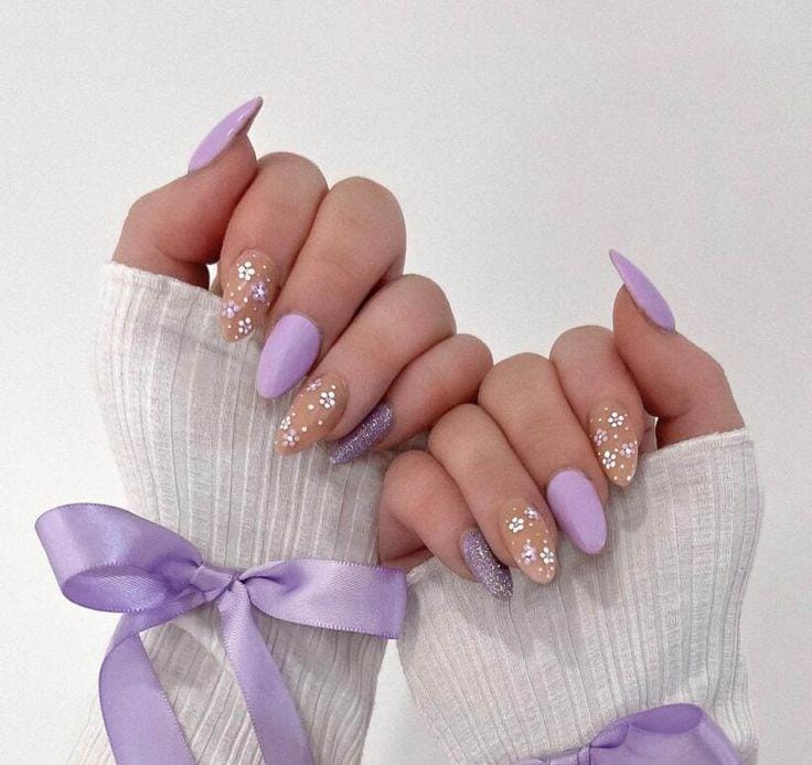 This design combines soft lavender nails with nude accents decorated with tiny white daisies. The pastel purple and delicate floral details create a gentle, fresh spring vibe that feels elegant and playful.