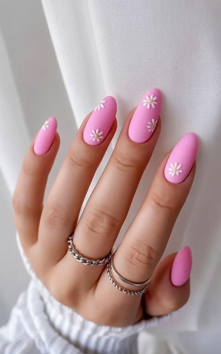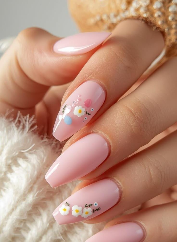 These nails feature a smooth pastel pink base with simple white daisy flowers scattered across the nails. The clean design and soft color give it a sweet, minimal Easter and springtime feel.