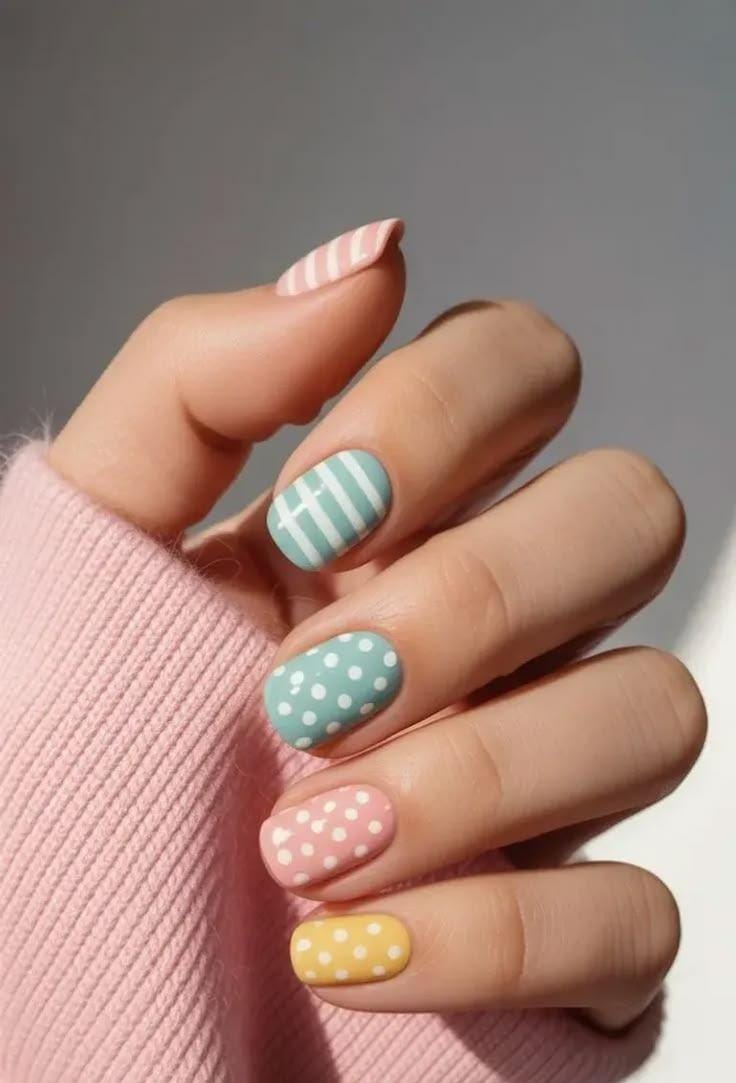 This design mixes soft pastel shades like mint, pink, and yellow with playful white polka dots and simple striped accents. The cheerful colors and fun patterns give the nails a light, candy-like Easter vibe.