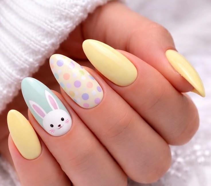 These nails feature soft pastel yellow and mint tones with a cute bunny accent and colorful dotted details. The bright yet gentle colors create a sweet, festive Easter look that feels fun and adorable.