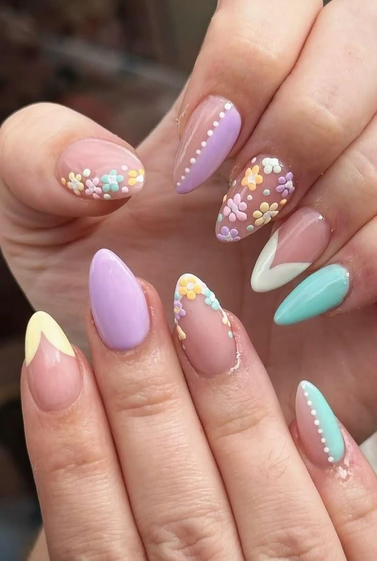 A playful mix of pastel lavender, mint, yellow, and nude shades creates a soft spring palette. Tiny flowers, dotted accents, and modern tips give the manicure a cheerful Easter garden vibe.