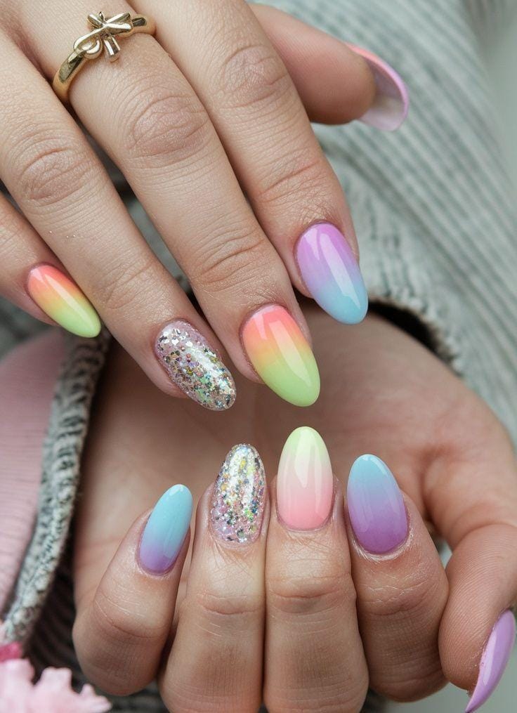 Soft rainbow pastel shades blend into a smooth ombre effect across the almond-shaped nails. A couple of glitter accent nails add extra sparkle, giving the design a fun and dreamy Easter vibe.