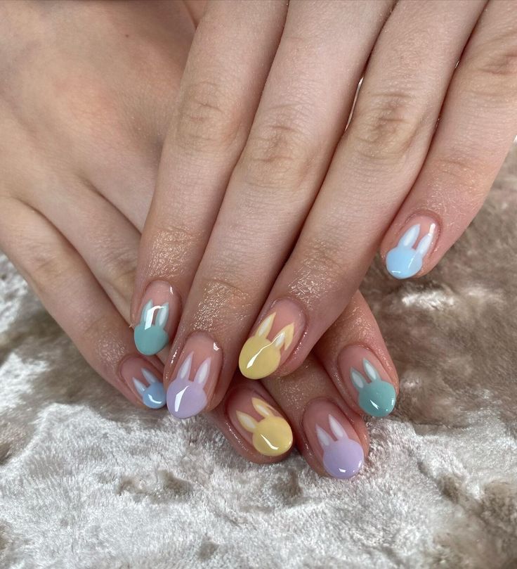 Soft pastel nails in shades of mint, pink, yellow, and peach feature adorable bunny faces for a playful Easter look. The simple designs and cute characters give the manicure a sweet and cozy springtime vibe.