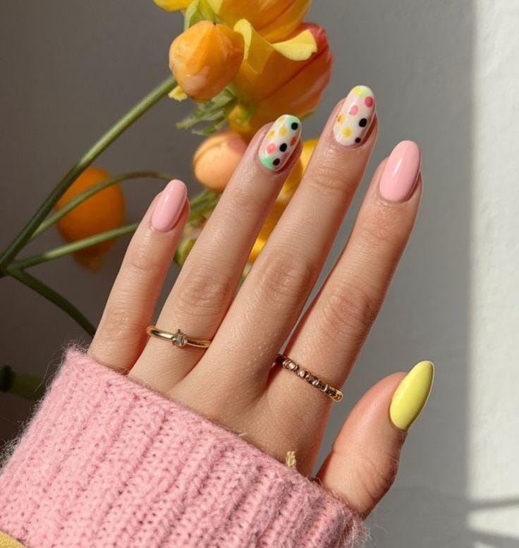 This cheerful design mixes pastel pink and bright yellow with colorful striped patterns inspired by decorated Easter eggs. The playful lines and dots give the nails a fun, festive, candy-like spring feel.