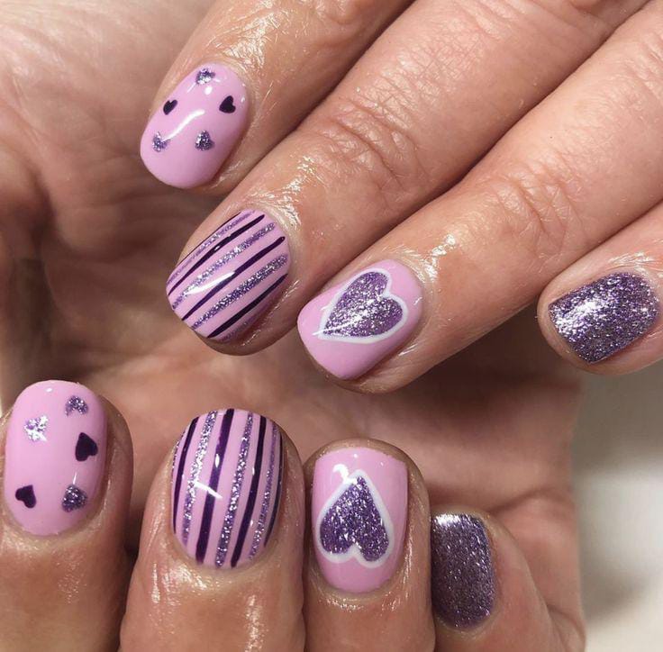 This design mixes soft pink polish with purple glitter hearts, stripes, and accent nails for a playful Valentine’s vibe. It feels cute and fun with a touch of sparkle.