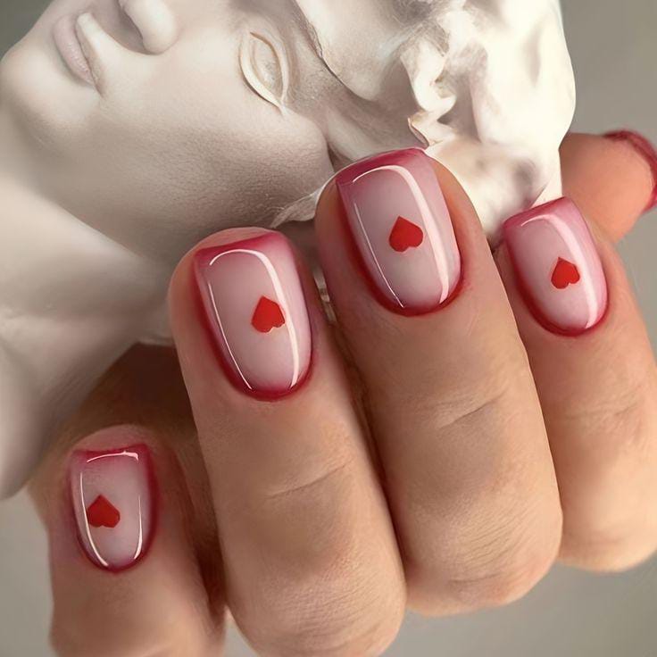 These nails feature a sheer pink base with soft red borders and a tiny red heart in the center of each nail. The look is simple, clean, and sweetly romantic Valentine’s look.
