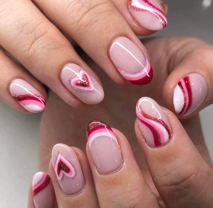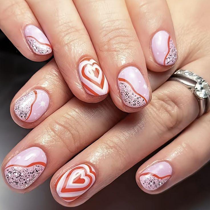 A pink base is paired with glittery sections, wavy lines, and layered heart outlines for a bold but soft Valentine’s style. The mix of shimmer and curves gives it a cute, artistic feel.