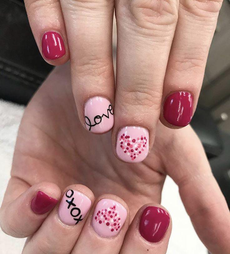 This set blends deep pink nails with light pink accent nails decorated with handwritten-style words LOVE and dotted heart shapes. It creates a cute, sentimental look that feels playful yet romantic Valentines.