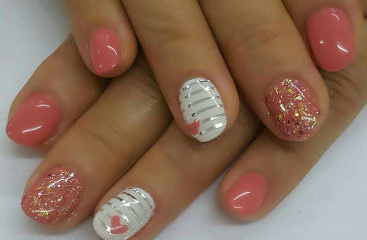 Coral nails are paired with glittery accents and a striped white nail featuring tiny heart details. The overall look feels bright, youthful, and cute perfect for a soft Valentine’s theme.