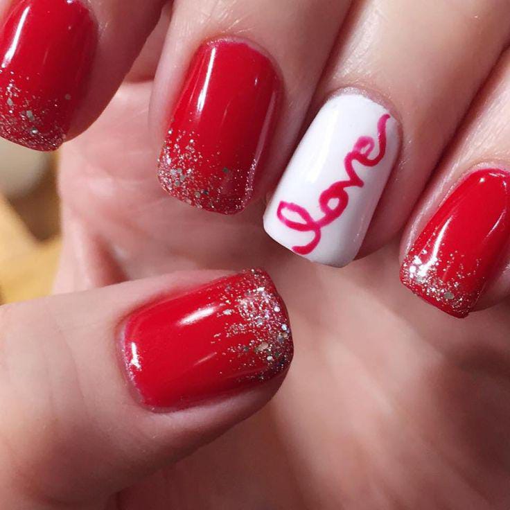 A bold red manicure with silver glitter-dusted tips, paired with a single white accent nail featuring the word “love” in a cute handwritten script. The look is simple, vibrant, and perfect for a classic Valentine vibe.