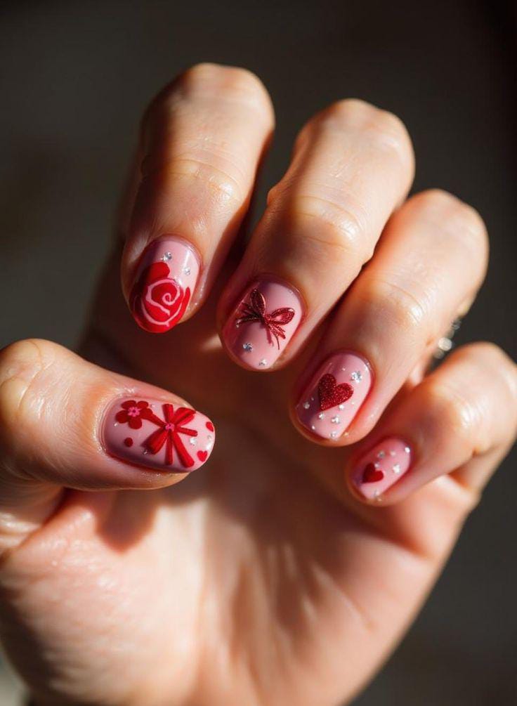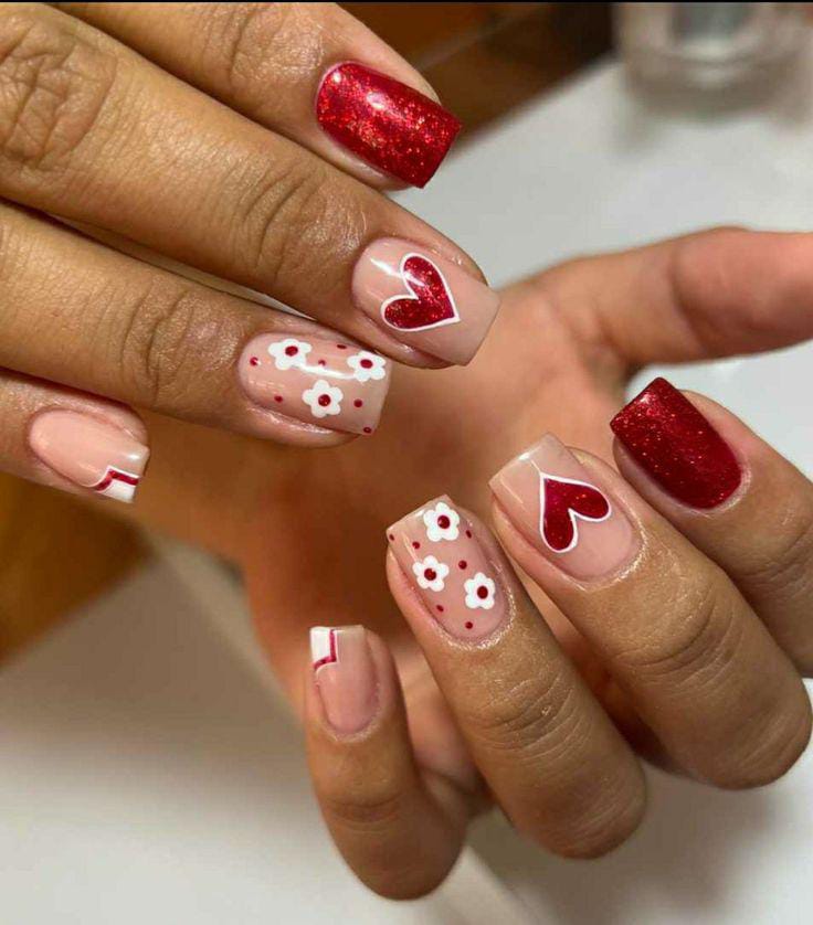 Soft nude nails are paired with red glitter accents, outlined hearts, and tiny white floral patterns for a charming, feminine Valentine design.