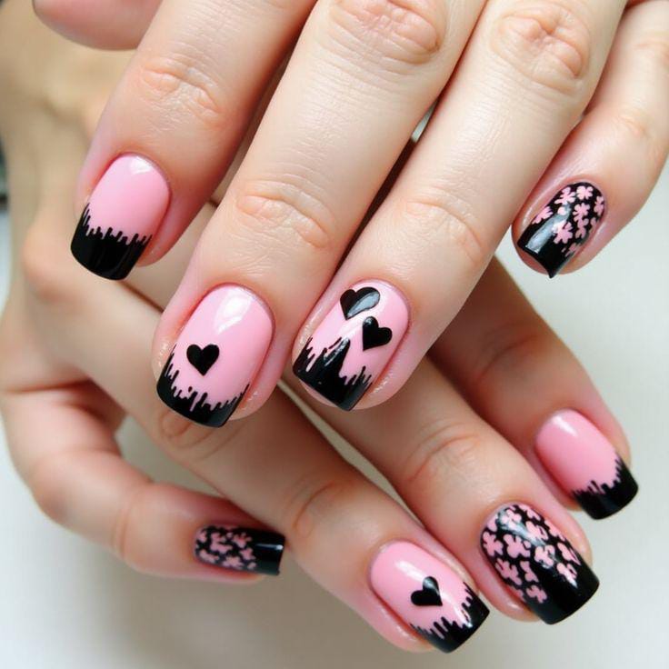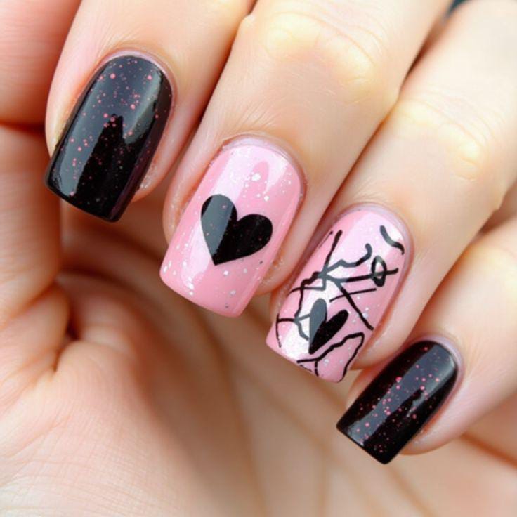 Glossy black and pale pink nails mixed with bold black hearts and abstract line art for a striking contrast. This design blends soft romance with a modern, cute Valentine twist.
