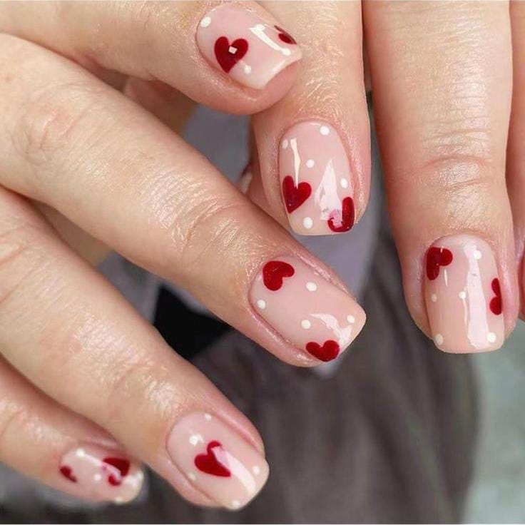 Short nude nails sprinkled with white dots and bright red hearts, creating a light and playful confetti effect. It’s a cute, easygoing Valentine look that still feels stylish.