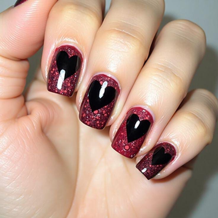 This design features a rich ruby-red glitter base topped with bold black heart silhouettes, giving the nails a dramatic, romantic and cute vibe. The contrast makes the hearts stand out beautifully for a striking Valentine’s look.