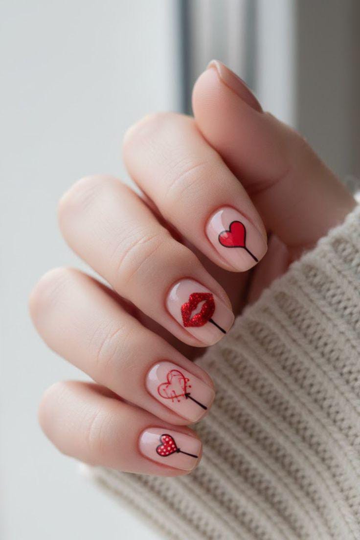Soft nude nails decorated with tiny red hearts, lips, and simple line art create a cute, delicate Valentine’s theme. The design feels playful and light while still being perfectly cute and festive.