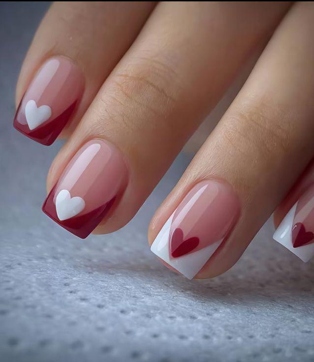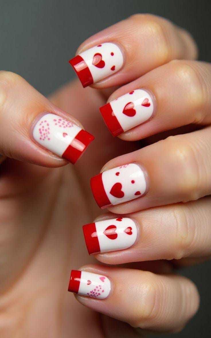 This design mixes bright red polish with soft nude bases, accented by playful heart illustrations and curved French tips for a bold yet cute Valentine vibe.