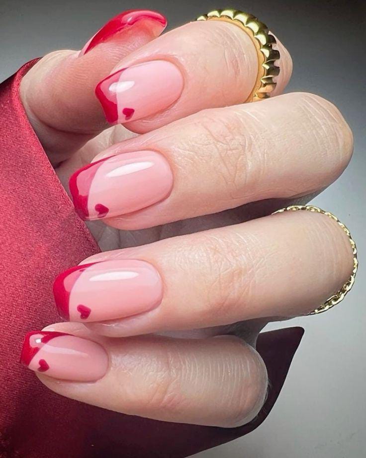 A soft nude base is topped with bold red French tips, each accented with tiny heart shapes that add a sweet, cute Valentine twist.