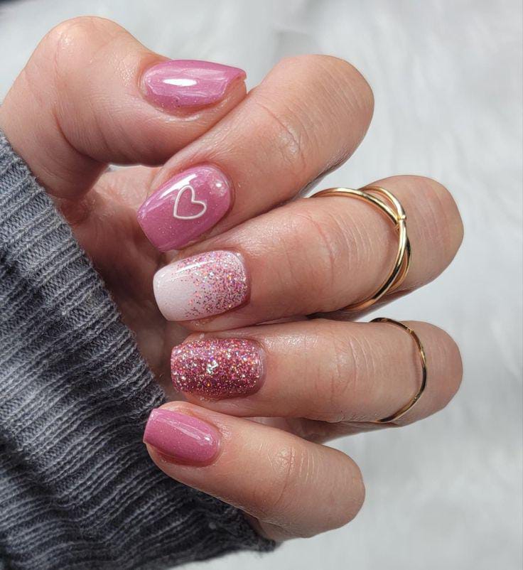 These nails combine rosy pink polish with glitter accents and a small outlined heart for a soft romantic Valentine’s look. The style is cute, feminine, and beautifully simple.