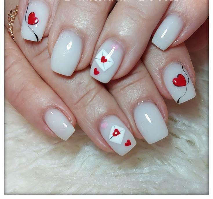 Soft milky-white nails are decorated with tiny red hearts and adorable envelope motifs, giving a clean, sweet, and romantic Valentine’s aesthetic.