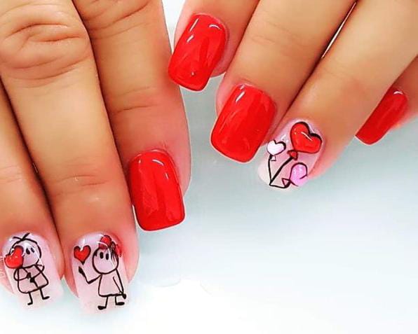 A bright red manicure paired with cute stick-figure characters holding hearts gives this look a playful, storybook Valentine vibe.
