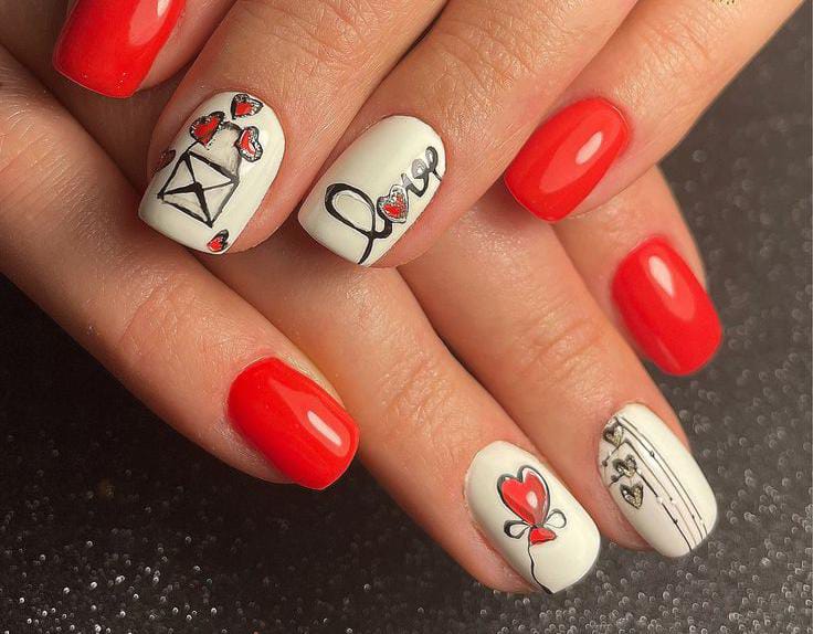 This design blends glossy red nails with white accent nails decorated with hearts, envelopes, and the word love, creating a charming, romantic theme. It feels fun, cute and expressive, and perfect for Valentine’s messaging.