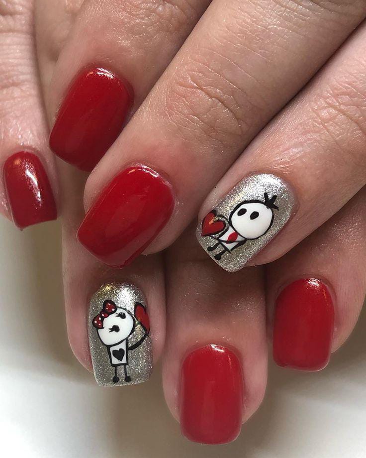 Rich red nails are matched with silver glitter accents featuring adorable stick-figure characters holding hearts. The combination of sparkle and cute artwork gives it a fun, whimsical cute Valentine feel.