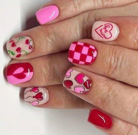 This set features bright pinks, reds, and nude tones with various heart patterns and a playful checkered nail. It has a fun, cute, and artsy vibe perfect for Valentine standing out.