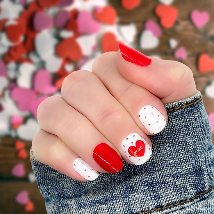 A mix of bright red and crisp white nails decorated with tiny hearts creates a clean, romantic look. The bold “XOXO” heart accent adds a cute Valentine statement without feeling overdone.