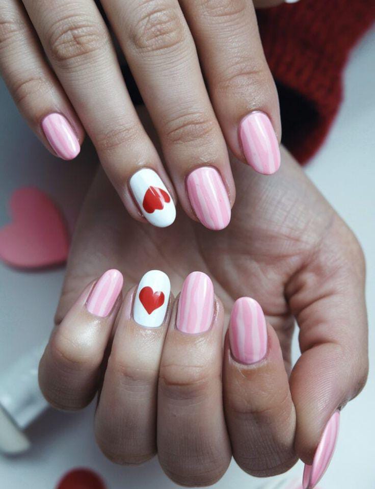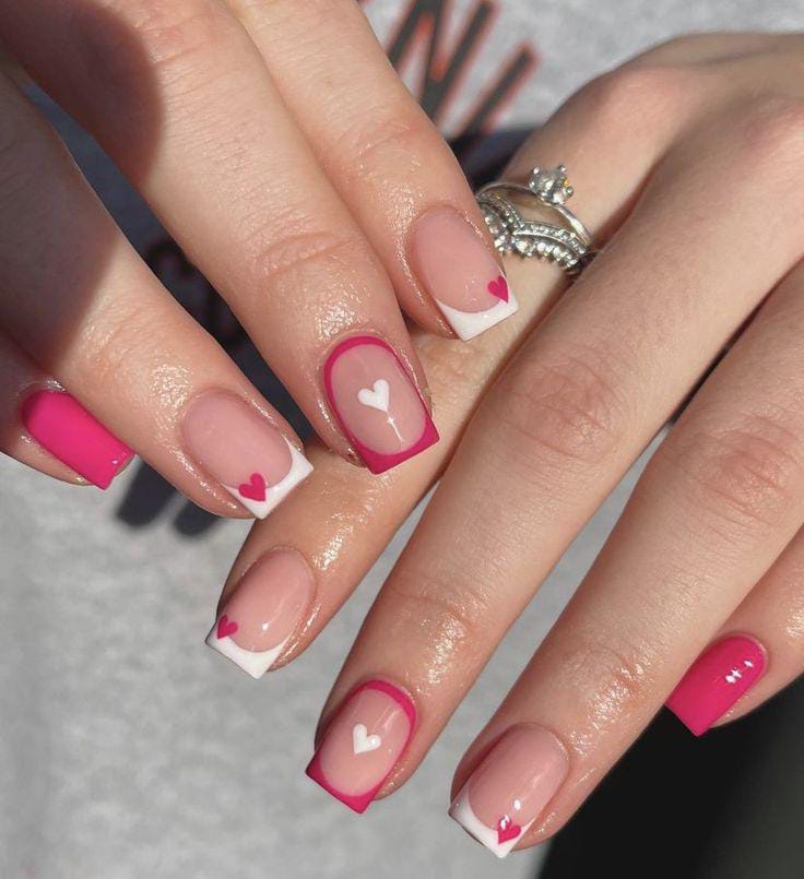 These nails mix bright pink accents with crisp white tips, each decorated with small hearts for a cute Valentine twist. The look is playful, fresh, and youthful.