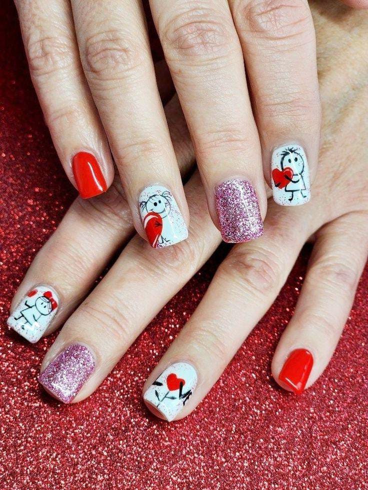This design mixes bold red nails with playful stick-figure art on white accents, creating a cute, cartoon-style love theme. The little characters and hearts give it a fun, youthful Valentine’s vibe.