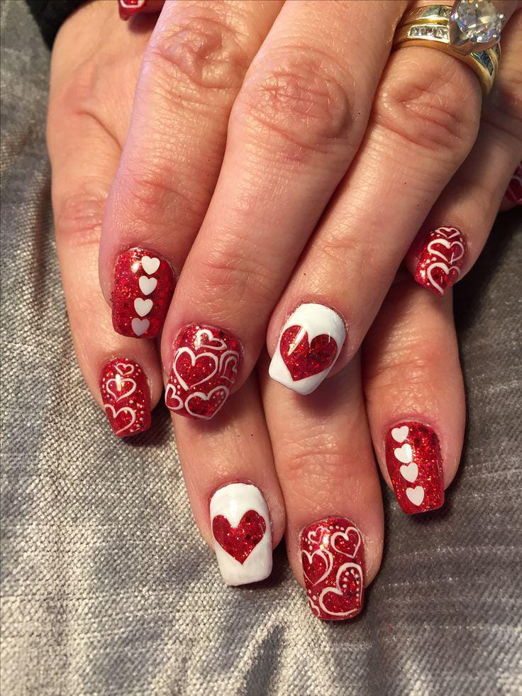 A mix of red, white, and glitter nails creates a bold yet cute Valentine combo with small heart details. It feels playful and balanced, blending solid colors with simple love- Valentine themed art.