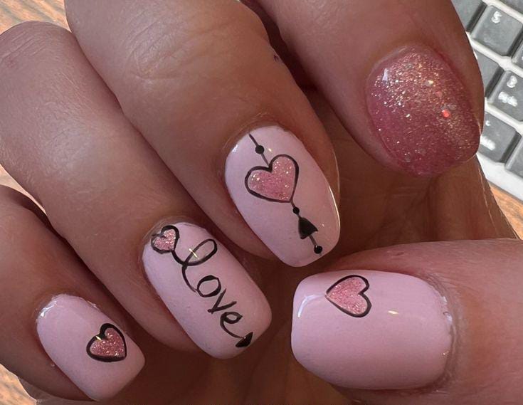 Soft pastel pink nails are decorated with glitter hearts, dainty line art, and a handwritten-style “love” that feels cute and romantic. The mix of shimmer and doodle-like detailing gives it a cozy, heartfelt Valentine’s look.