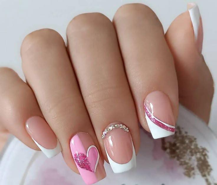 This set blends white and pink tips with glittery heart accents for a soft, cute Valentine design. The added rhinestone curve gives it a delicate, glamorous touch.