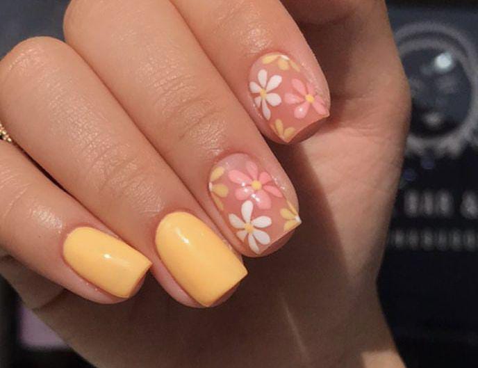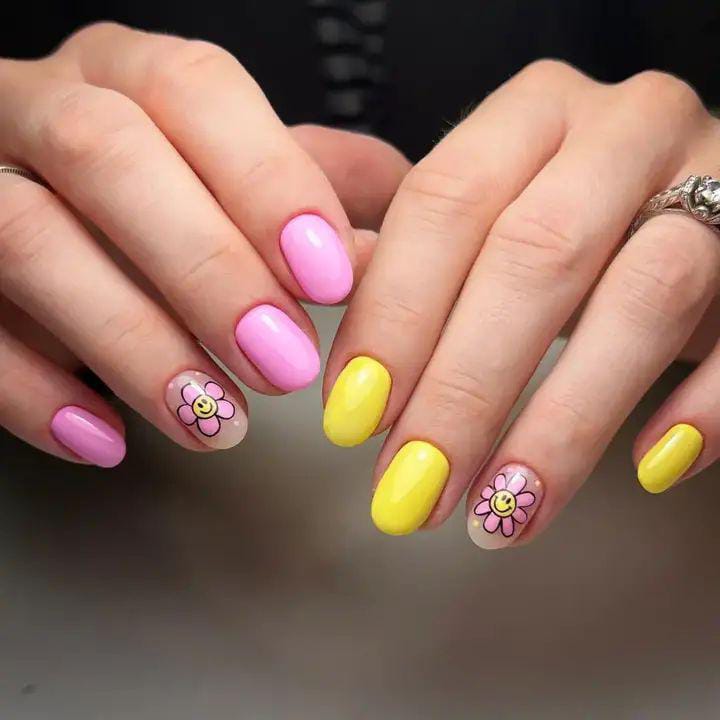 This design mixes soft pink and sunny yellow shades with cute daisy accents for a playful summer feel. The look is bright, cheerful, and perfect for short nails that still want to stand out.