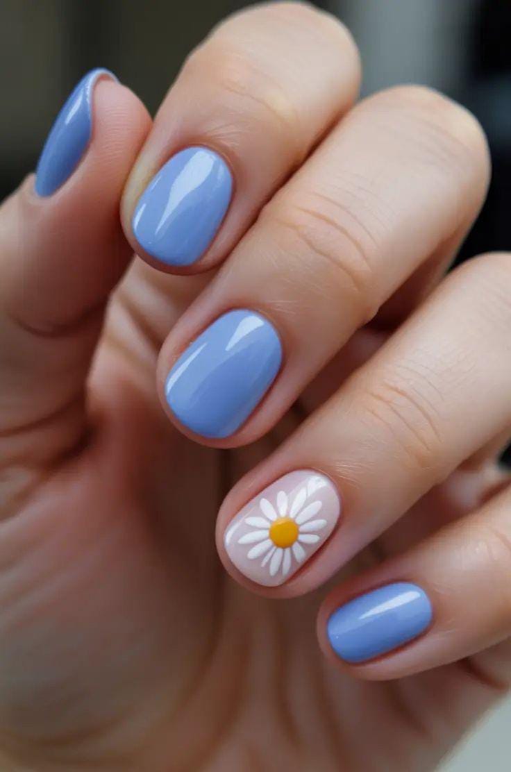 Smooth baby blue short nails are paired with a tiny daisy accent for a clean, minimal look. The overall vibe is soft, fresh, and perfectly summery.