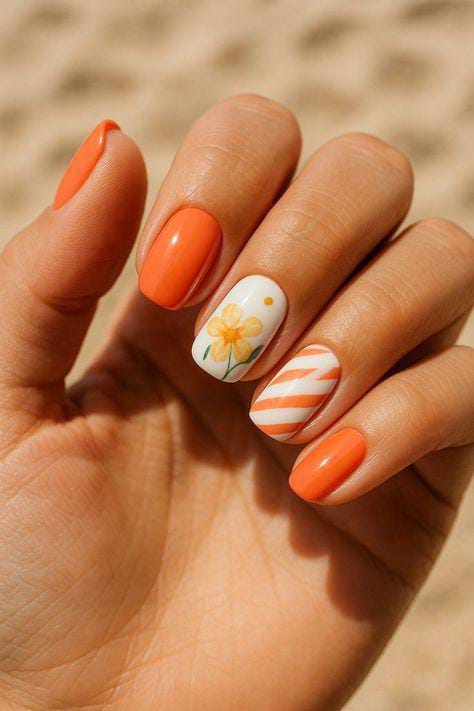 Bright orange short nails are paired with simple white accents, including a tiny floral detail and soft stripes. The look feels fresh, cheerful, and perfect for sunny summer days.
