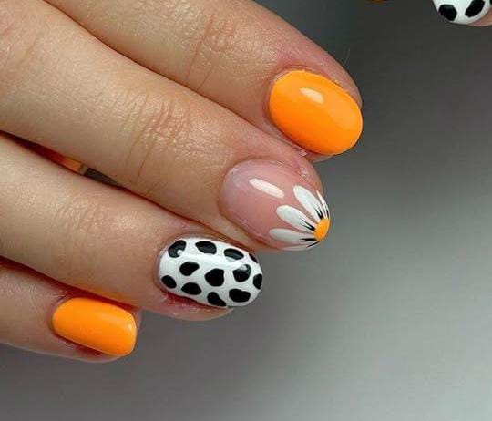 Bold orange short nails are balanced with a nude base, daisy art on the tip , and fun black-and-white spots. The design feels cute, youthful, and full of summer energy.