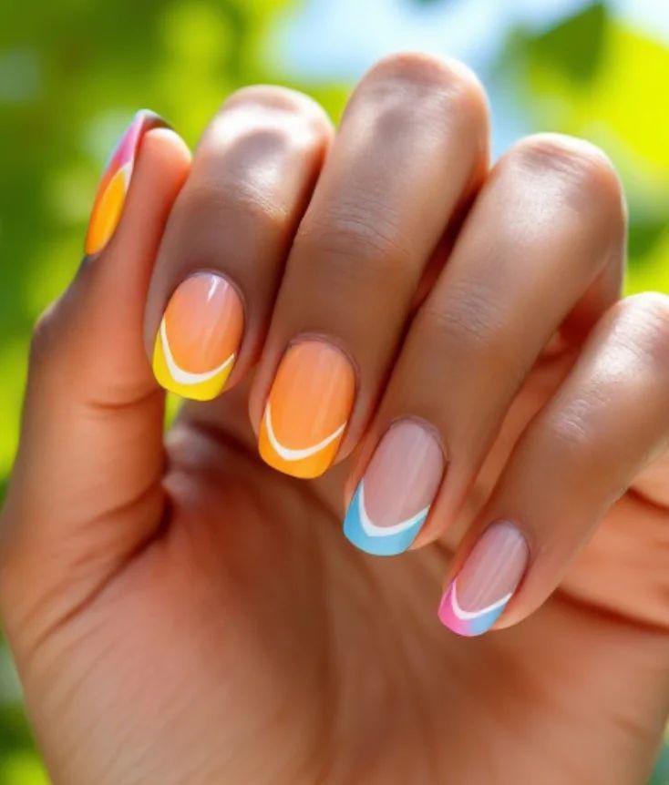 Sheer nude short nails feature curved French tips in soft pastel colors like yellow, blue, and nude pink. The overall look is minimal, modern, and effortlessly summery.