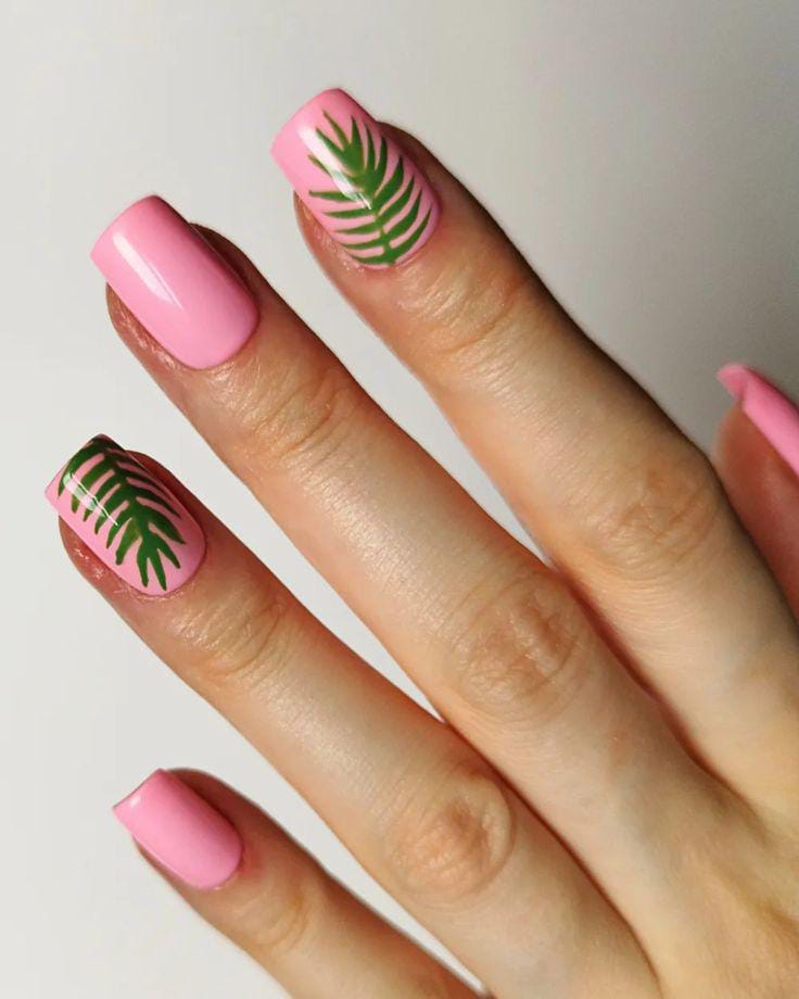 Light pink short nails are decorated with simple green palm leaf accents. This design gives off a relaxed tropical summer vibe that’s clean and easy to wear.