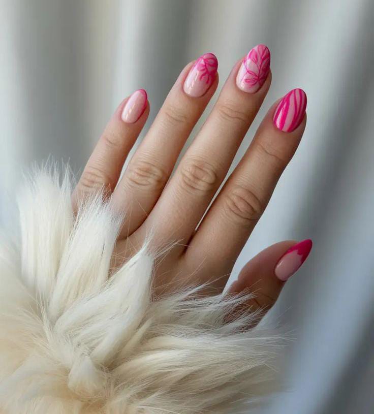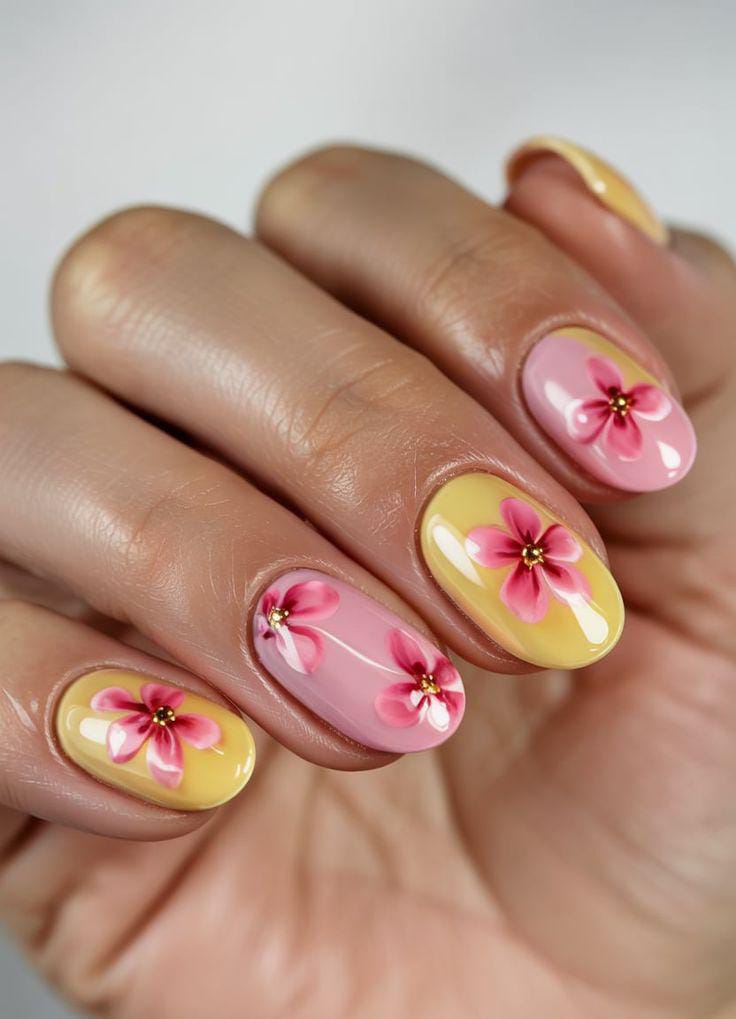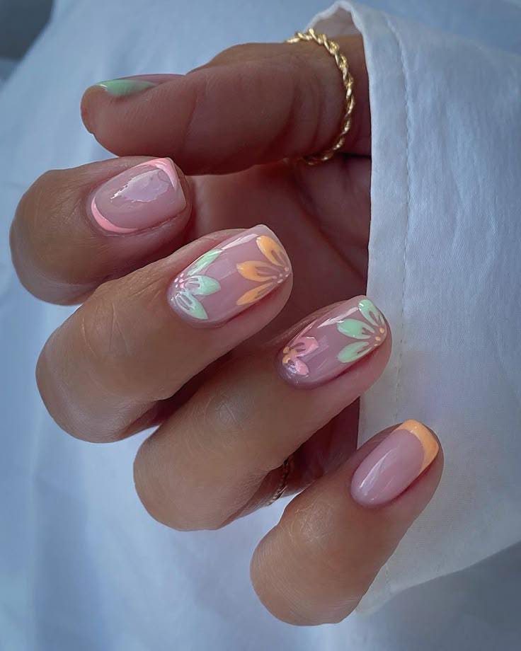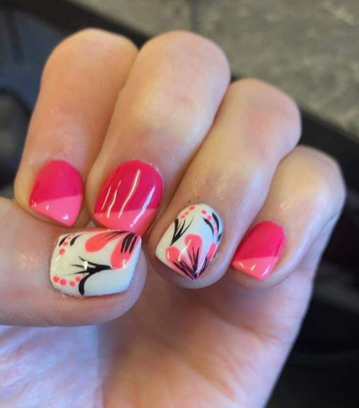 Different pink shades come together with a cute floral feature for a soft but lively look. It feels feminine, fresh, and perfect for short summer nails.