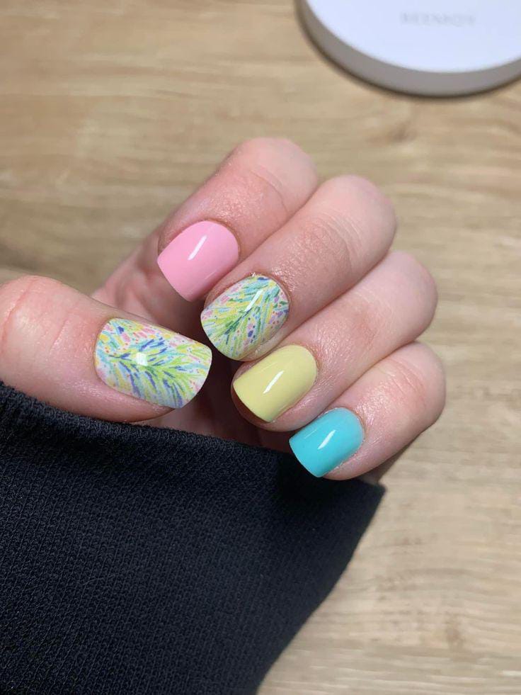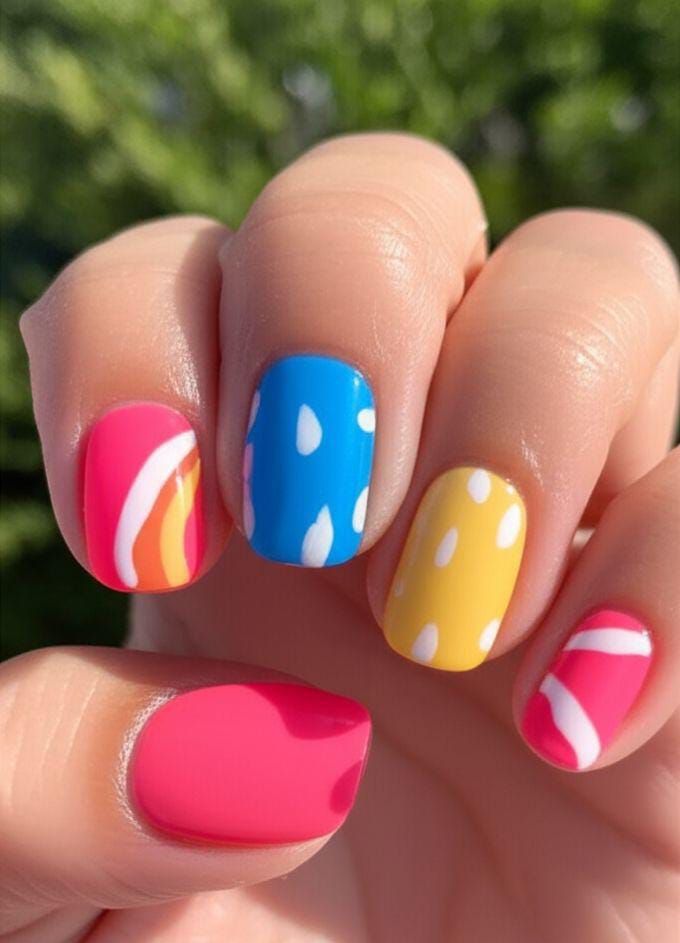 Bright pink, blue, and yellow short nails mix with simple dots and curved accents for a fun, youthful style. It has a bold yet easygoing summer energy.