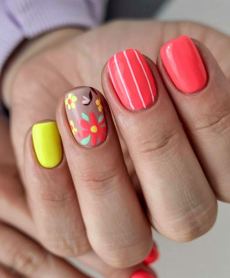 Vibrant coral and yellow short nails are balanced with a single floral nude accent nail and clean line details. The overall vibe is playful, colorful, and effortlessly summery.