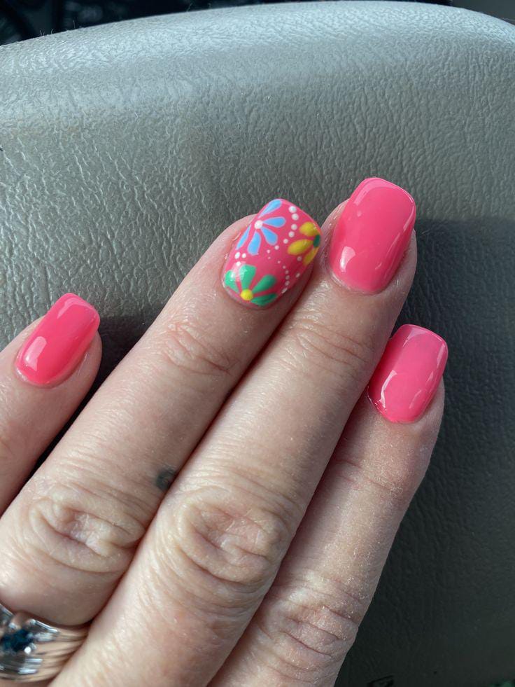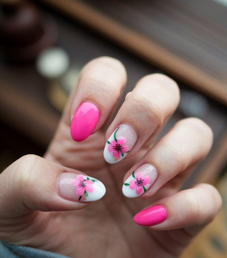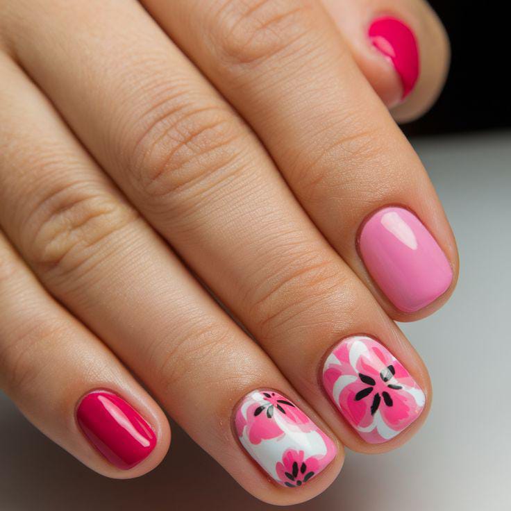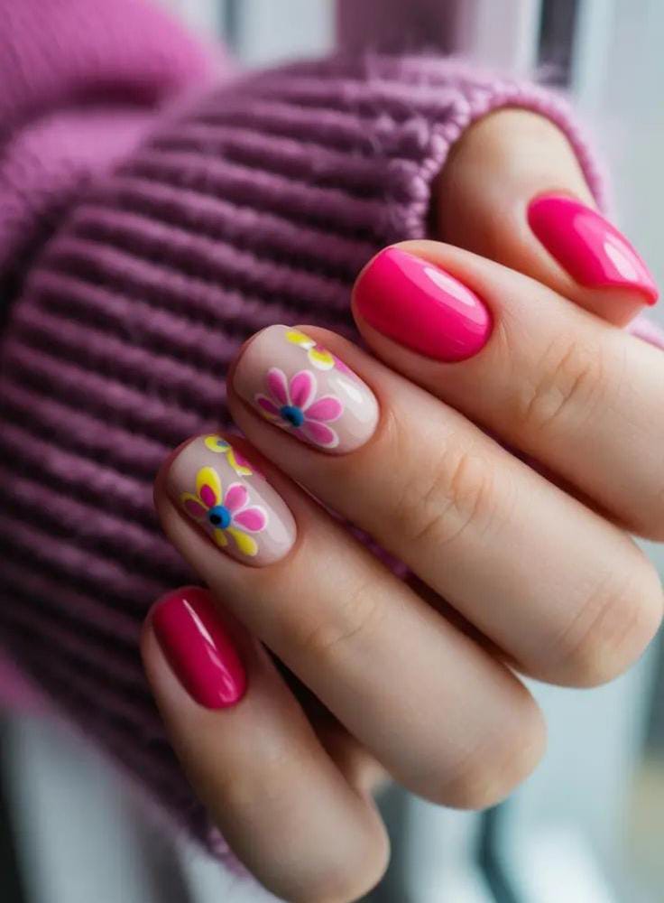 Bold pink short nails are balanced with nude accents decorated with small, colorful flowers for a soft contrast. This design feels sweet, girly, and ideal for a fun yet simple summer manicure.