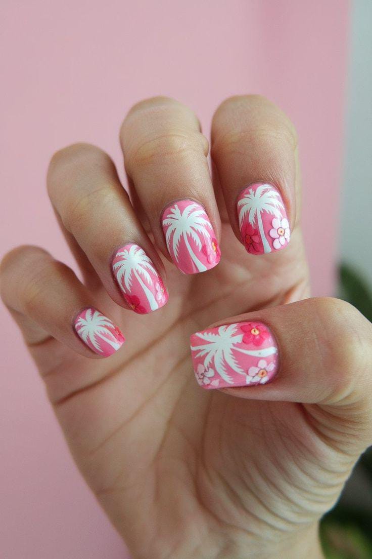 Soft pink short nails are decorated with white palm trees and tiny floral accents for a minimal summer feel. The overall look is playful, bright, and perfect for vacation vibes.