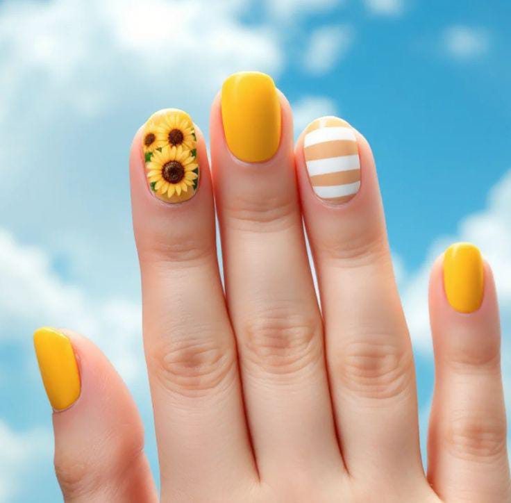 Warm yellow short nails are paired with sunflower art and simple striped accents for a cheerful look. This design feels fresh, fun, and full of summer sunshine.