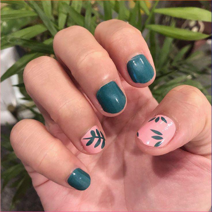 Deep green short nails are mixed with blush accents featuring minimalist leaf patterns. The color combo feels calm, modern, and inspired by summer nature.