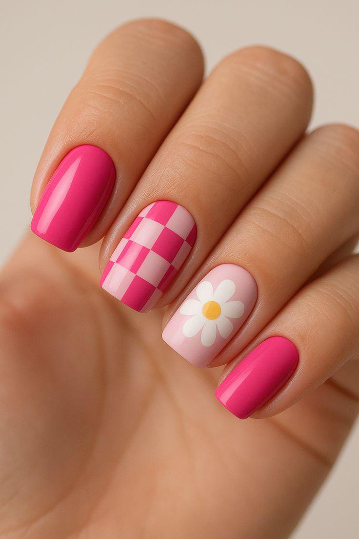 This design features bright pink short nails paired with soft gingham checks and a clean daisy accent for a cute, coordinated look. The overall vibe is playful, fresh, and perfect for casual summer outfits or sunny weekends.