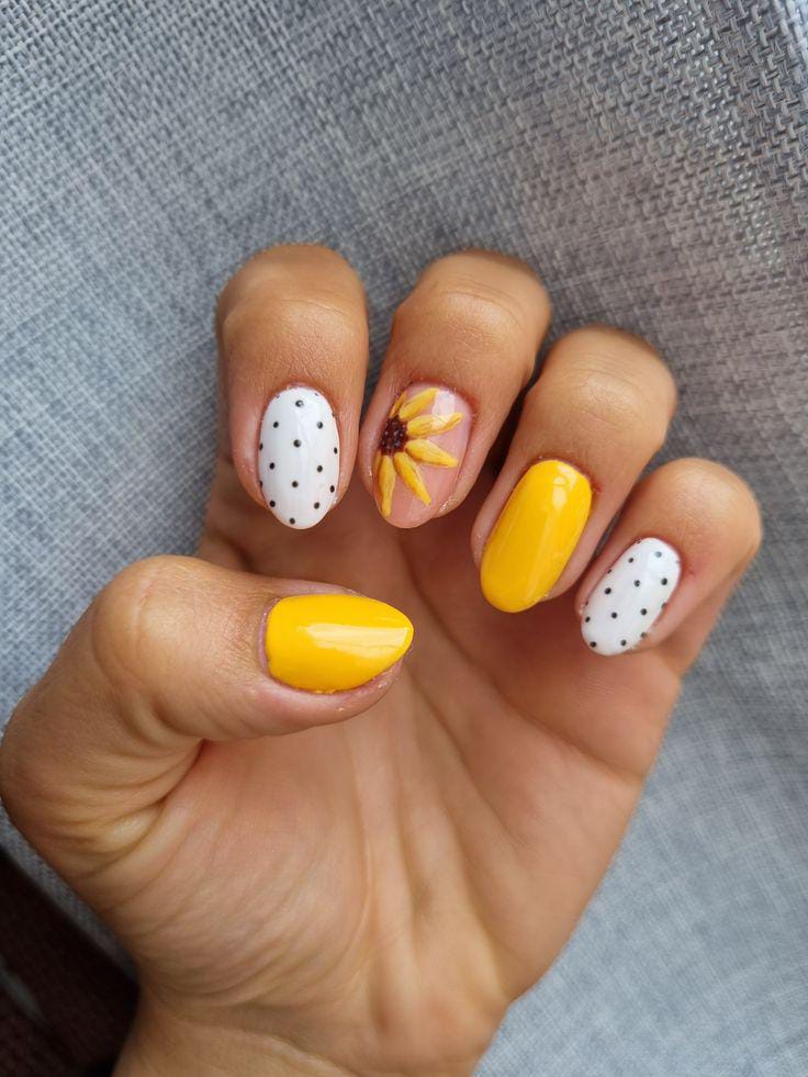 Warm yellow and white short nails are mixed with black polka dots and a delicate floral detail on nude base that adds charm without feeling easy. The style feels cheerful, lighthearted, and full of sunny summer energy.