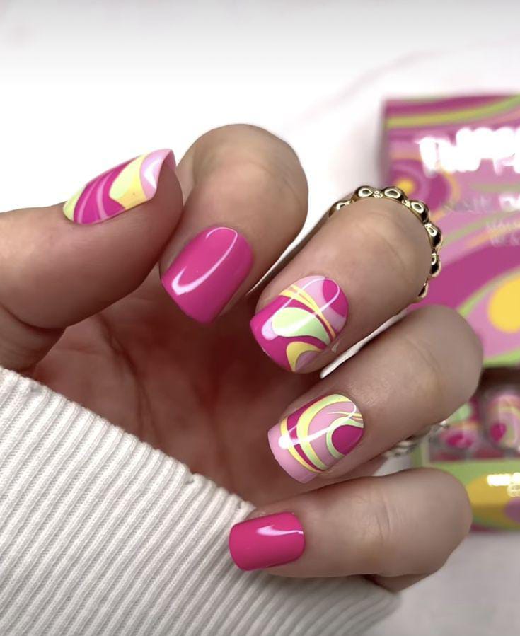 Bright pink short nails are paired with abstract swirls in yellow and light pink for a fresh, artistic touch. The design feels bold yet fun, making it a great choice for creative summer nail looks.